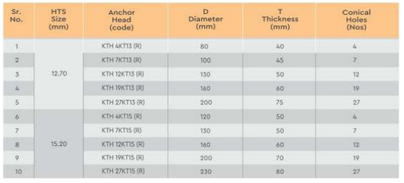 Anchor Head gets located on the flat surface of the Anchor Cone & offers seating of wedges. Tapered holes in Anchor Head facilitate the seating of wedges and holding the strands in stressed condition. Wedge holds the individual tensile element. The prestressing load is then transferred to the Anchor Head. Anchor Head is generally used in prestressed concrete segments and girders.